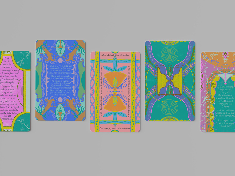 A calming, uplifting brand identity for a set of modern affirmation cards. The design blends soft colour palettes and hand-drawn typography to evoke clarity and self-connection. Every detail, from the packaging to the card layouts, was crafted to feel intentional, soothing, and empowering.